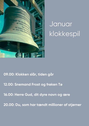 Januars Klokkespil. Hver dag i januar kan man høre klokkenist & organist Katrine Immerkjær Kristinasen spille på kirkens klokker. Se programmet herunder.